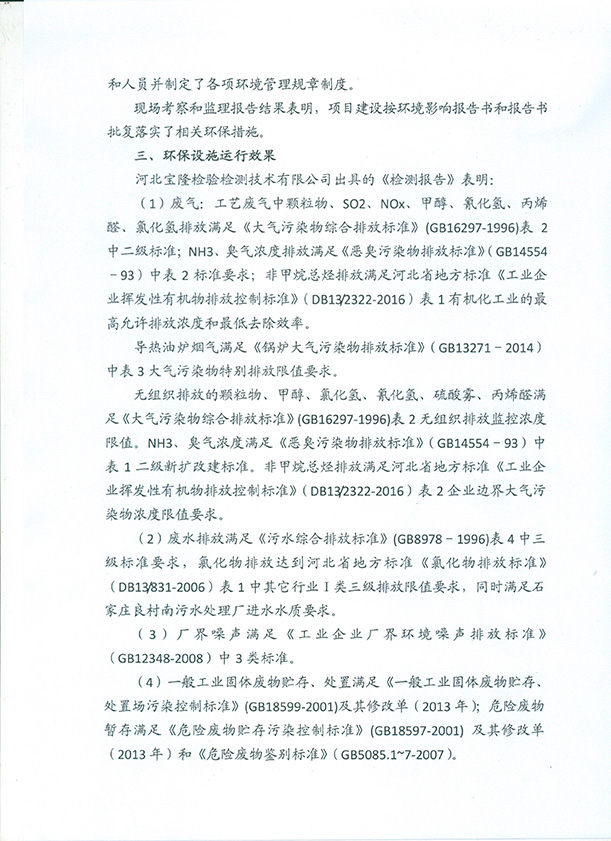 该项目于2016年4月开工建设,2016年12月完成项目建设,项目主体工程及其配套的环保设施已建设完成。并已按要求开展了建设项目环境监理工作。2017年8月河北威远生物化工有限公司委托河北宝隆检验检测技术有限公司对该项目进行了竣工环境保护验收监测。2017年11月8日组织了相关单位人员及专家成立了验收工作组,工作组同意本项目通过竣工环境保护验收。